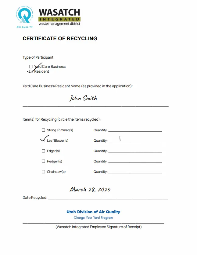 - I agree not to recycle old gas-powered yard equipment until I have received formal written approval from the Utah Division of Air Quality (UDAQ).